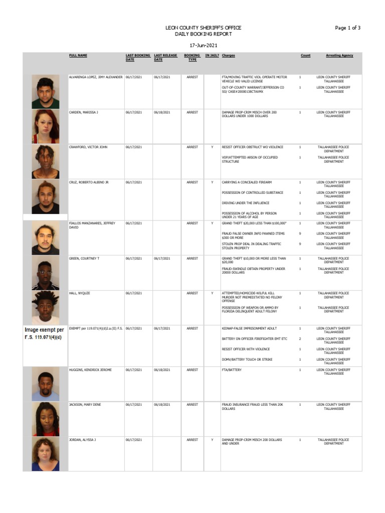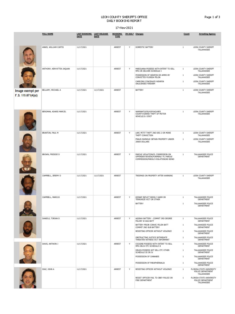 Home News leon county booking report november 10 2020. Honda silver cross aemi marcia 06262022 arrest y burglary of structure 1 tallahassee police department houston maurice b 06262022 arrest y battery 1 leon county sheriff tallahassee petit theft greater than 100 1 leon county sheriff tallahassee jones markey lavette 06262022 arrest y possession of cocaine 1 tallahassee police. Ad Criminal Records Personal Info Relatives Address Email Social Media Marriage More.